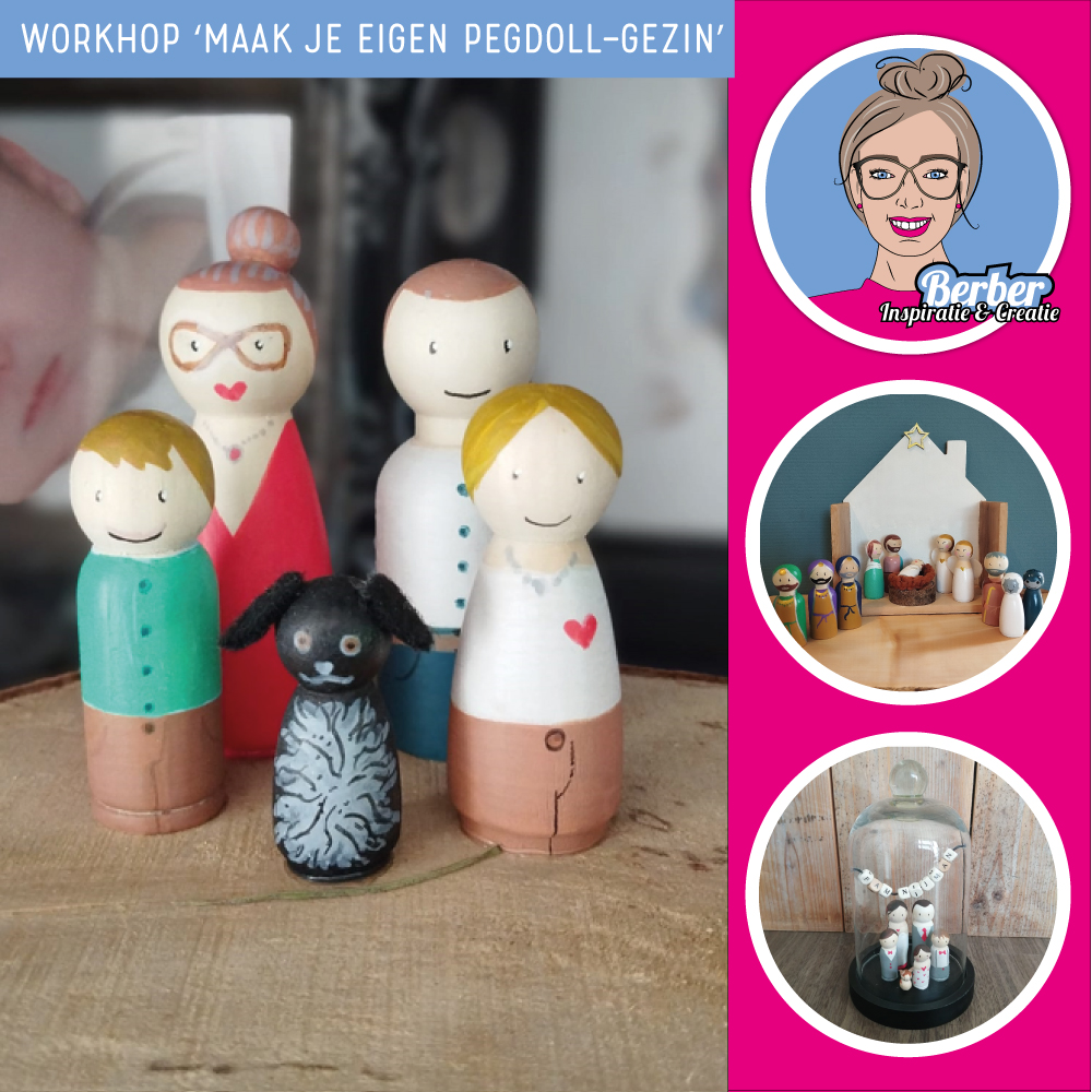 Onder begeleiding van kunstenares Berber maak je tijdens deze workshop van houten poppetjes (pegdolls genoemd) jouw eigen ‘Pegdoll-gezin’. Of je gezin nu uit 2 of 5 personen bestaat, met een hond of met een kat, blond of bruin haar, het maakt niet uit! Poppetjes en kleurtjes genoeg om met je eigen gezin aan de slag te gaan.