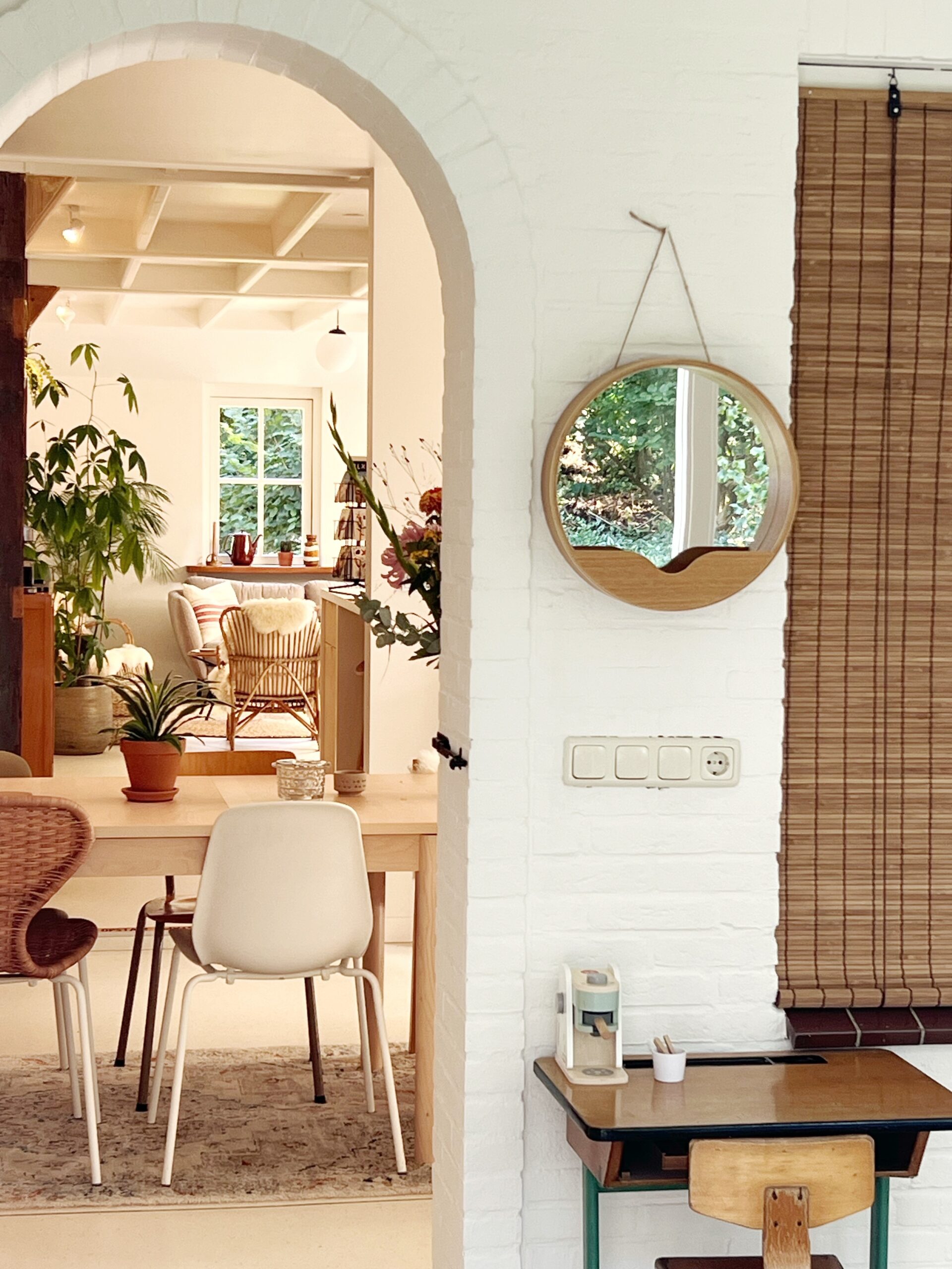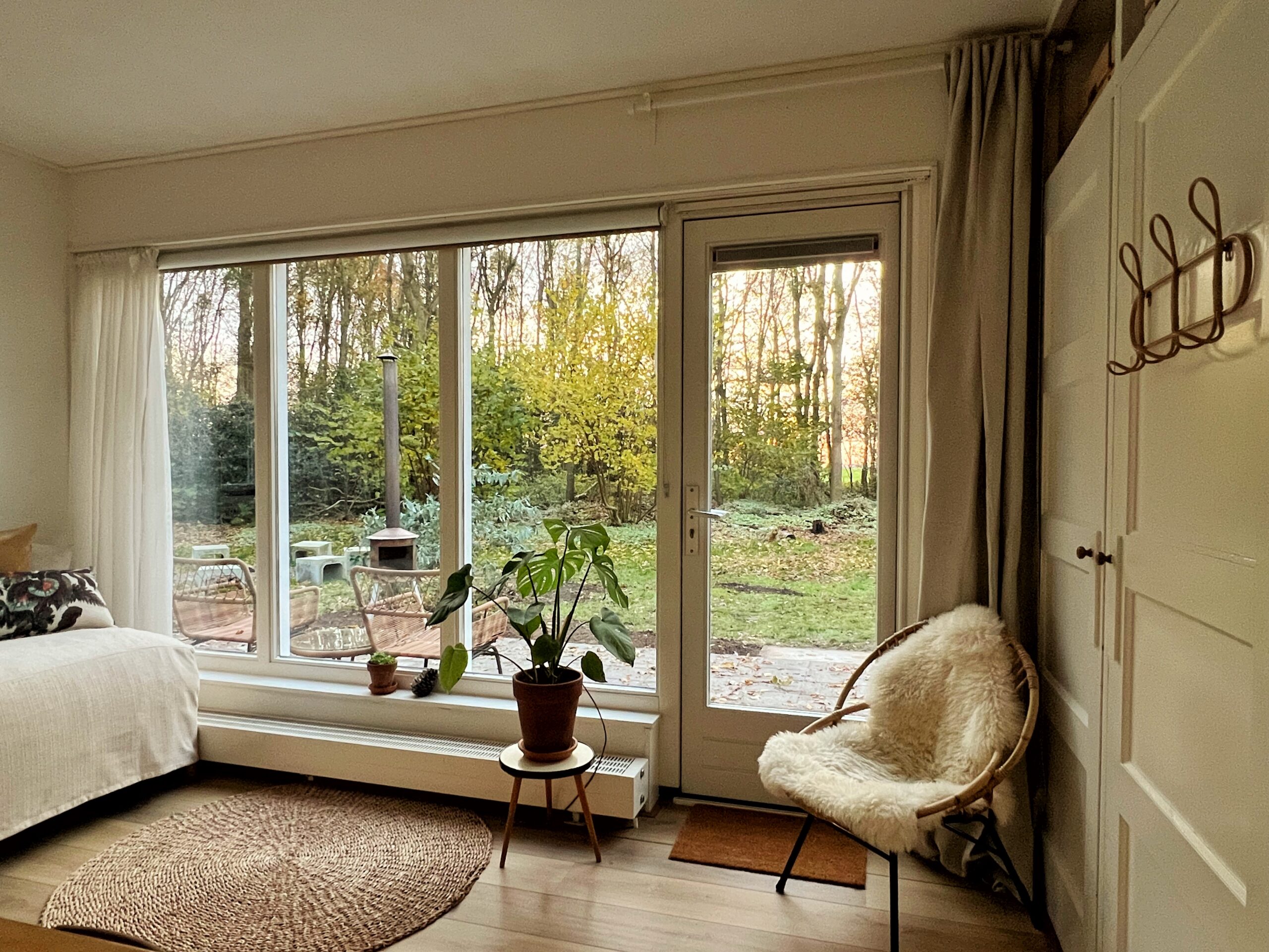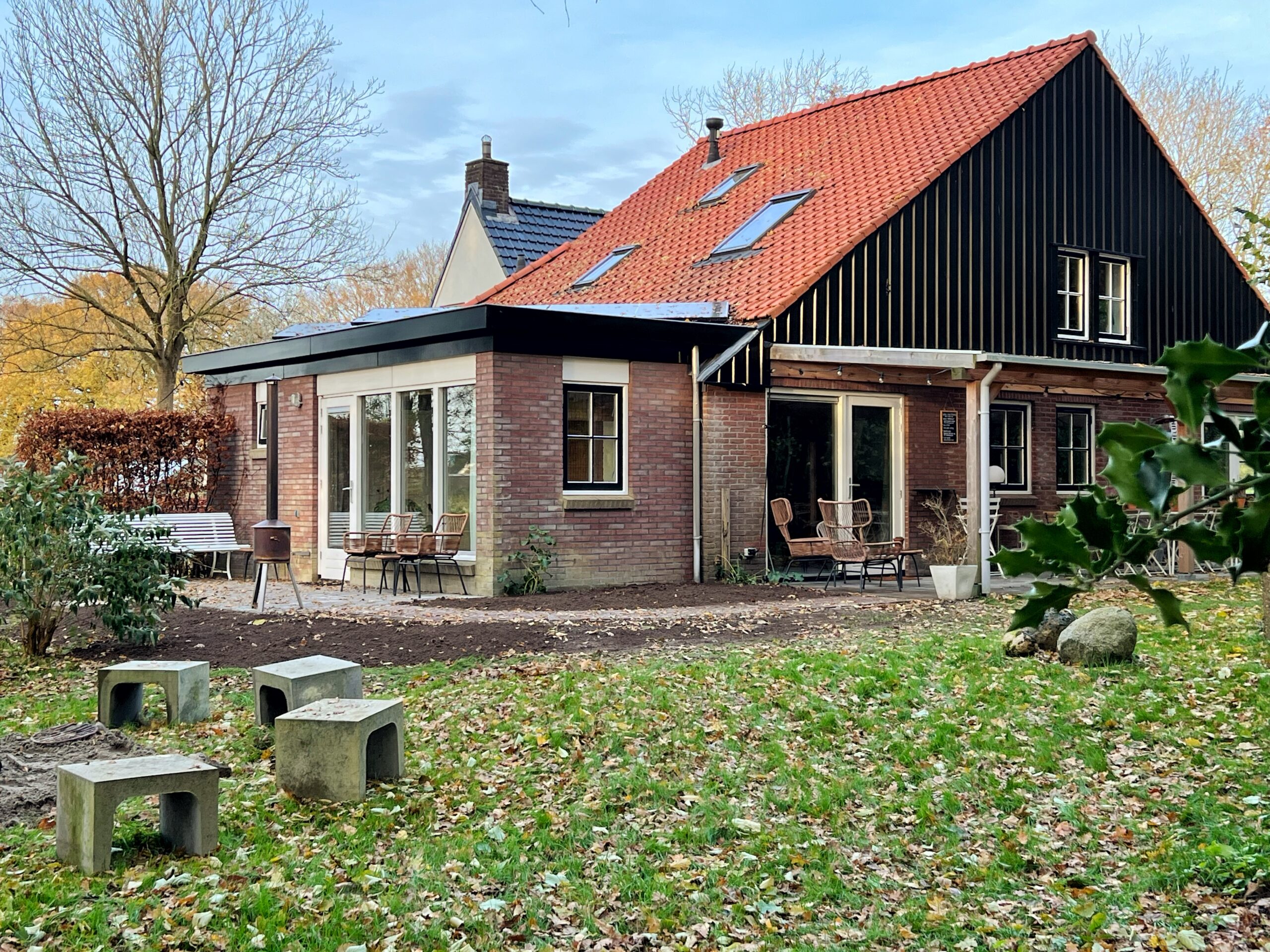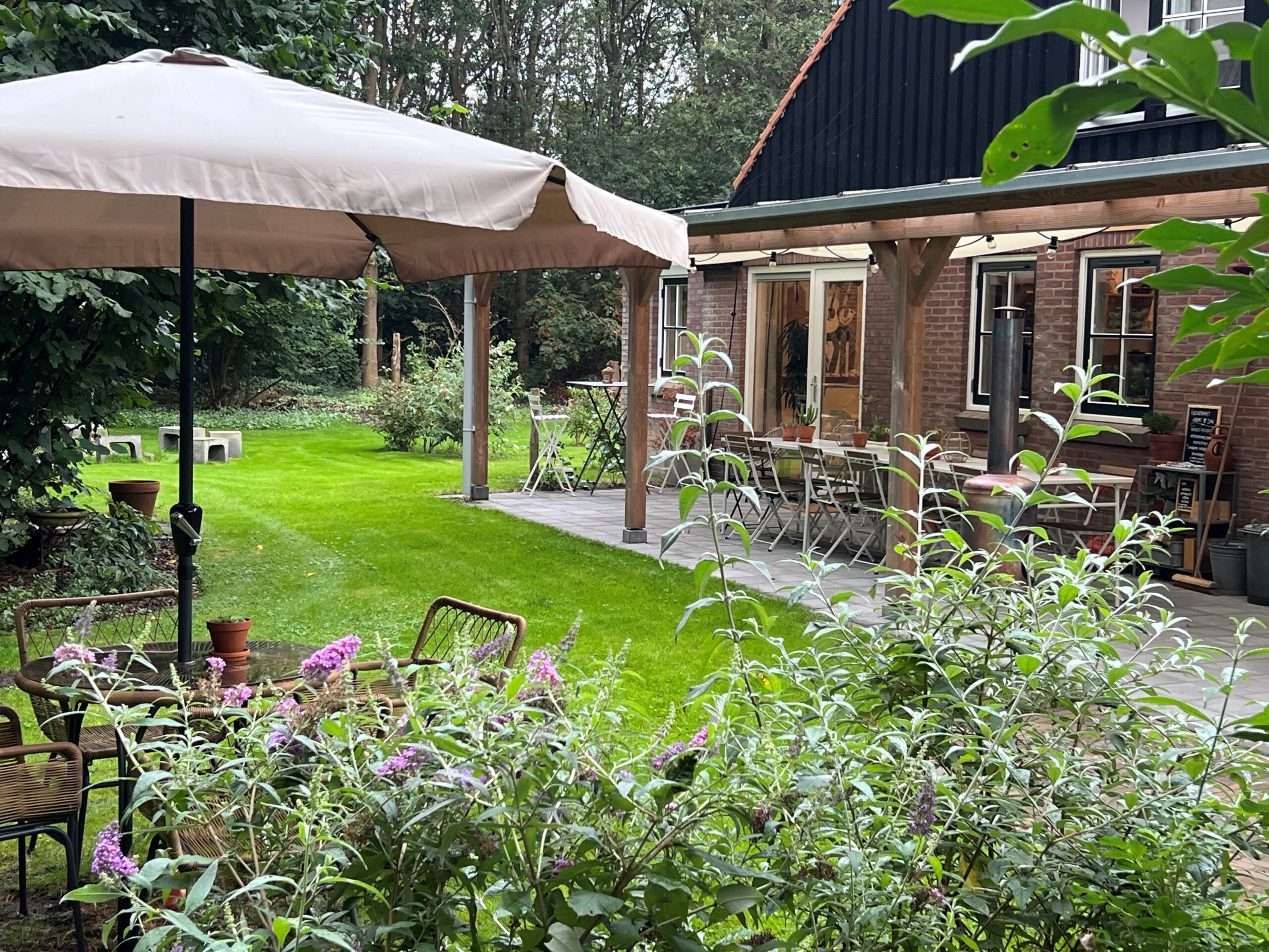 Binnen en buiten zijn veel mogelijkheden om gezamenlijk of apart van elkaar te kunnen vertoeven. Een deel van de voormalige boerderij met overdekt terras, de royale bostuin en de beschutting van het staatsbos, staan vanaf de vroege ochtend tot na zonsondergang tot je beschikking. Jong en oud voelt zich hier snel thuis.